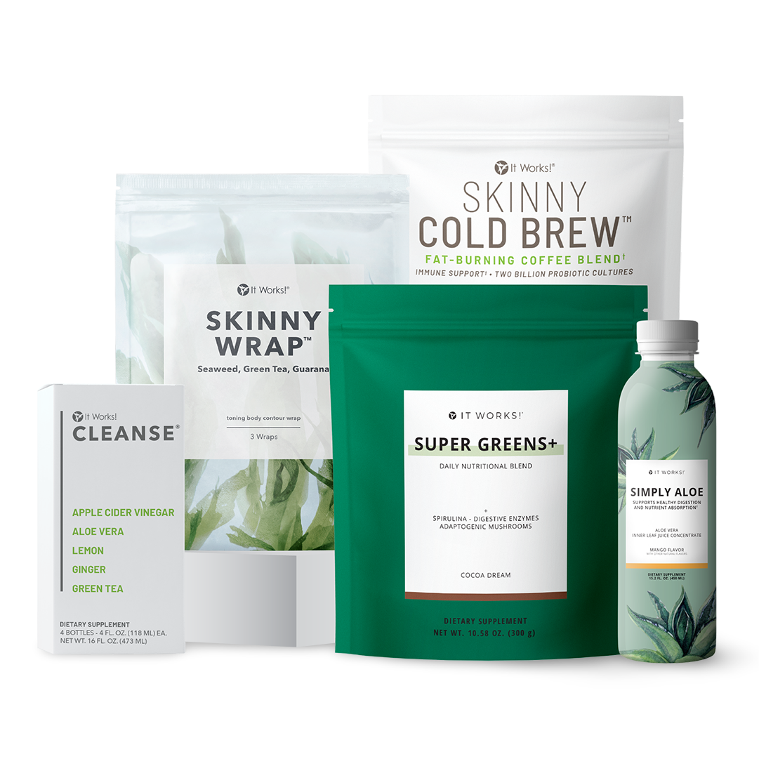 Feeling sluggish, bloated, and ready for a change? Our gentle It Works! Cleanse® leaves you lighter and refreshed after just two days!† It Works! Super Greens+ helps you fill many nutritional gaps that over 90% of people have—and even replaces your need for a daily multivitamin! When you sip It Works! Simply Aloe every day, you’ll also support healthy digestion and immunity†, while It Works! Skinny Wrap® firms problem areas that can be resistant to diet and exercise. It Works! Skinny Cold Brew™ supports a healthy microbiome in your gut with a clinically proven BI-04® probiotic.†