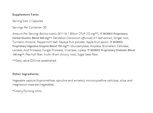 Amount Per Serving: Bacillus subtilis DE111® 1 Billion CFU* (15 mg**), It Works! Proprietary Herbal Diuretic Blend 400 mg**: Dandelion (Taraxacum officinale) 4:1 leaf extract, Ginger root, Turmeric rhizome, Peppermint leaf, Papaya fruit powder, Apple fruit pectin. It Works! Proprietary Digestive Enzyme Blend 150 mg**: Glucoamylase, Amylase, Bromelain, Cellulase, Lactase, Acid Protease, Fungal Protease, Invertase, Lipase. It Works! Proprietary Prebiotic Blend 100 mg**: Pea hull fiber, Inulin (from chicory root), Sugar beet fiber.