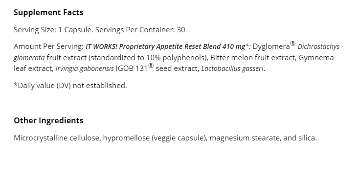 Amount Per Serving: It Works! Proprietary Appetite Reset Blend 410 mg*: Dyglomera® Dichrostachys glomerata fruit extract (standardized to 10% polyphenols), Bitter melon fruit extract, Gymnema leaf extract, Irvingia gabonensis IGOB 131® seed extract, Lactobacillus acidophilus.